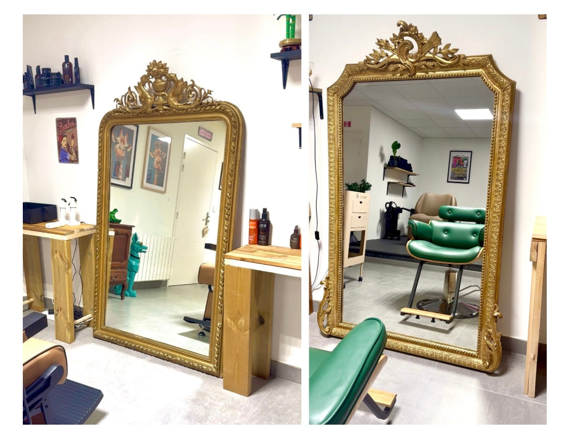 Deux grands miroirs anciens livrés dans un salon de coiffure en Bretagne.